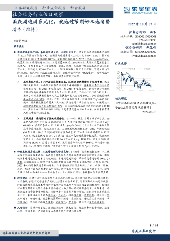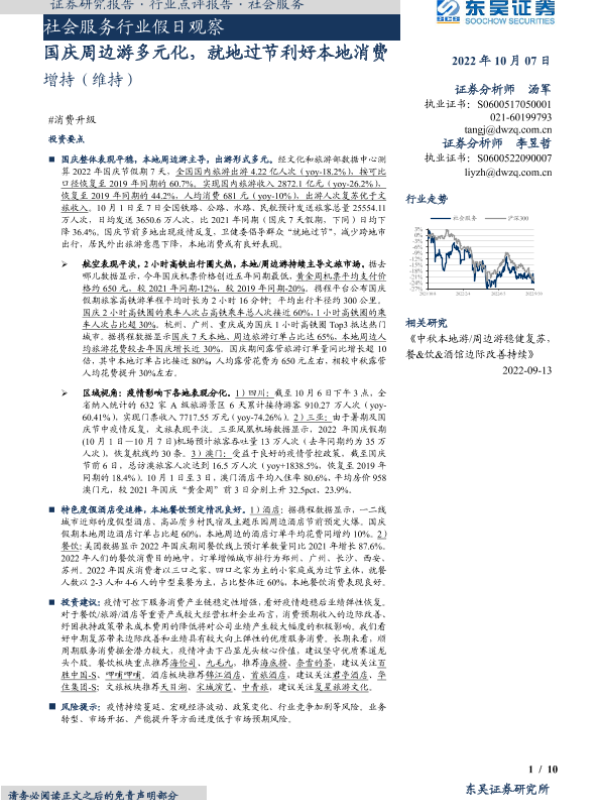 【东吴证券】【20221007】社会服务行业假日观察:国庆周边游多元化,就地过节利好本地消费-10页