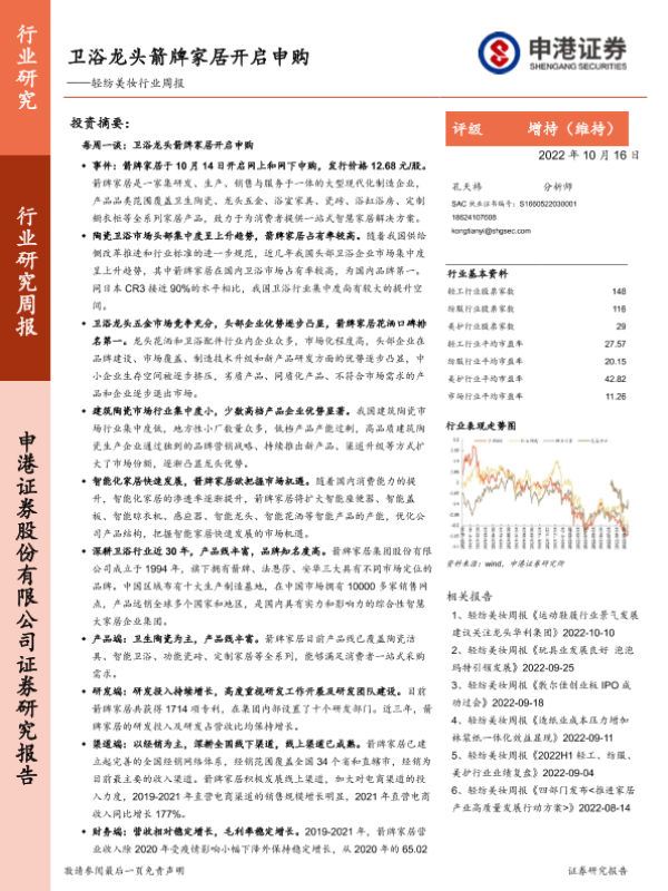 【申港证券】【20221016】轻纺美妆行业周报:卫浴龙头箭牌家居开启申购-18页