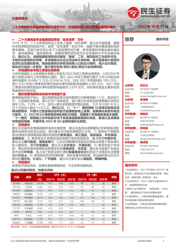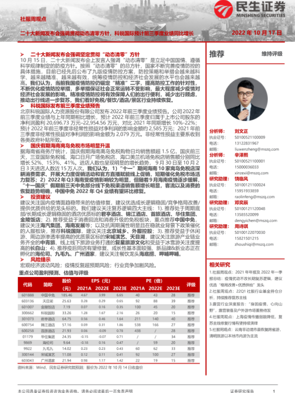 【民生证券】【20221017】社服周观点:二十大新闻发布会强调贯彻动态清零方针,科锐国际预计前三季度业绩同比增长-22页