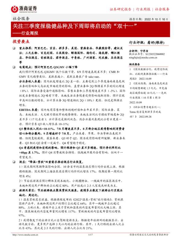 【浙商证券】【20221016】社会服务行业周报:关注三季度报稳健品种及下周即将启动的“双十一”-17页
