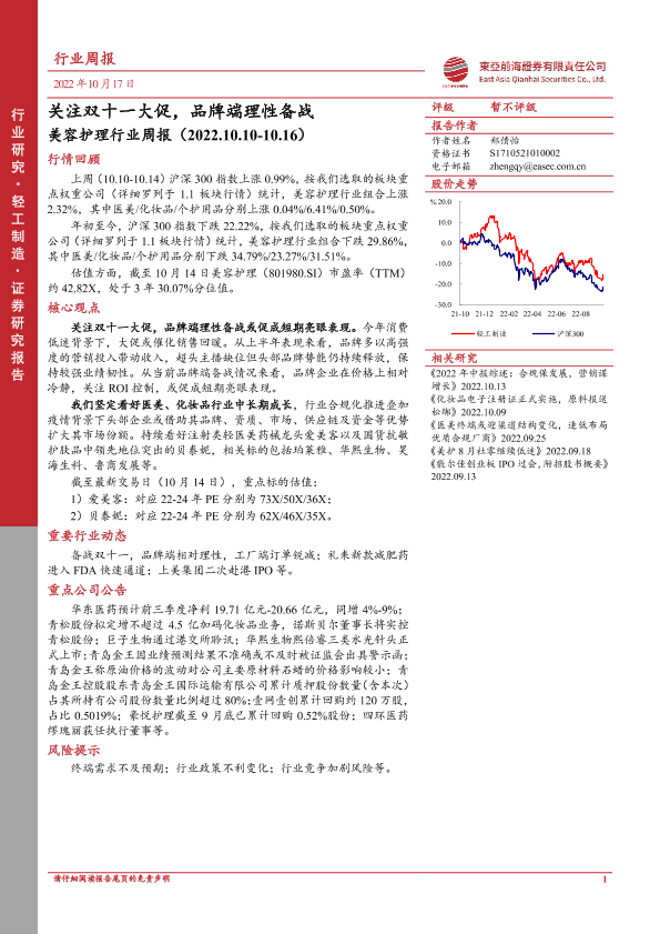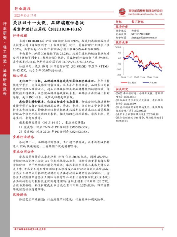 【东亚前海证券】【20221017】美容护理行业周报:关注双十一大促,品牌端理性备战-13页