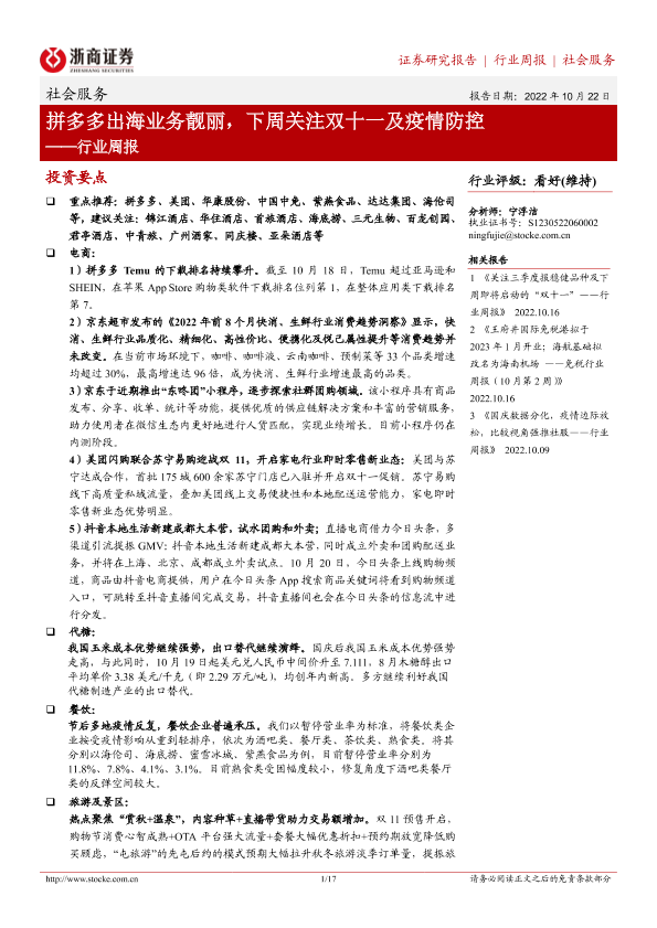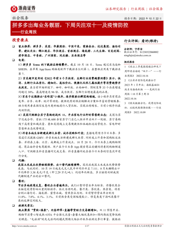 【浙商证券】【20221022】社会服务行业周报:拼多多出海业务靓丽,下周关注双十一及疫情防控-17页