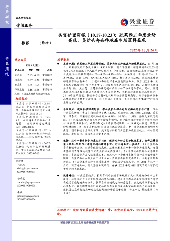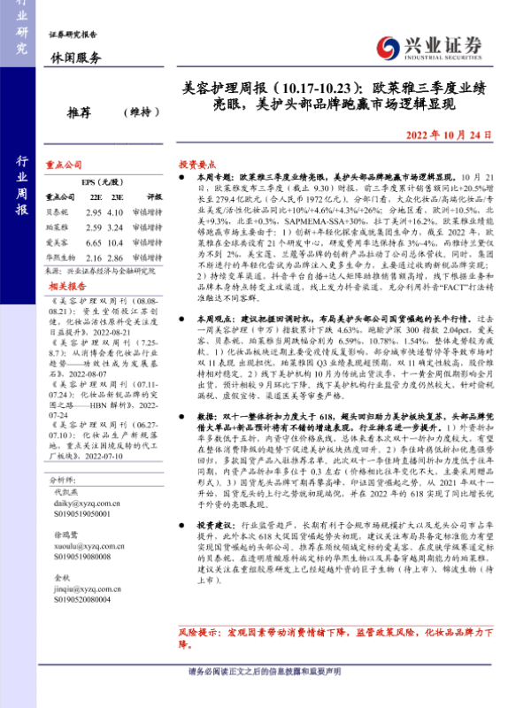 【兴业证券】【20221024】美容护理周报:欧莱雅三季度业绩亮眼,美护头部品牌跑赢市场逻辑显现-13页