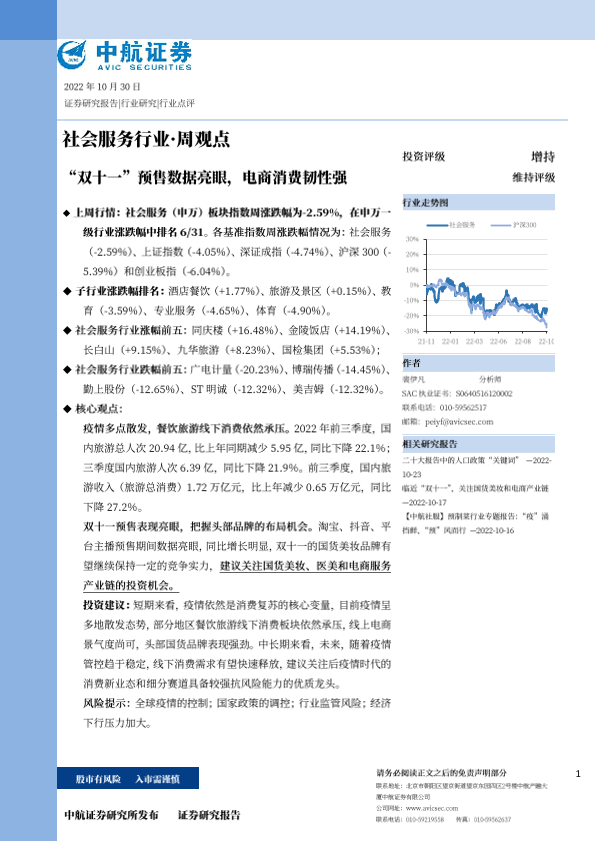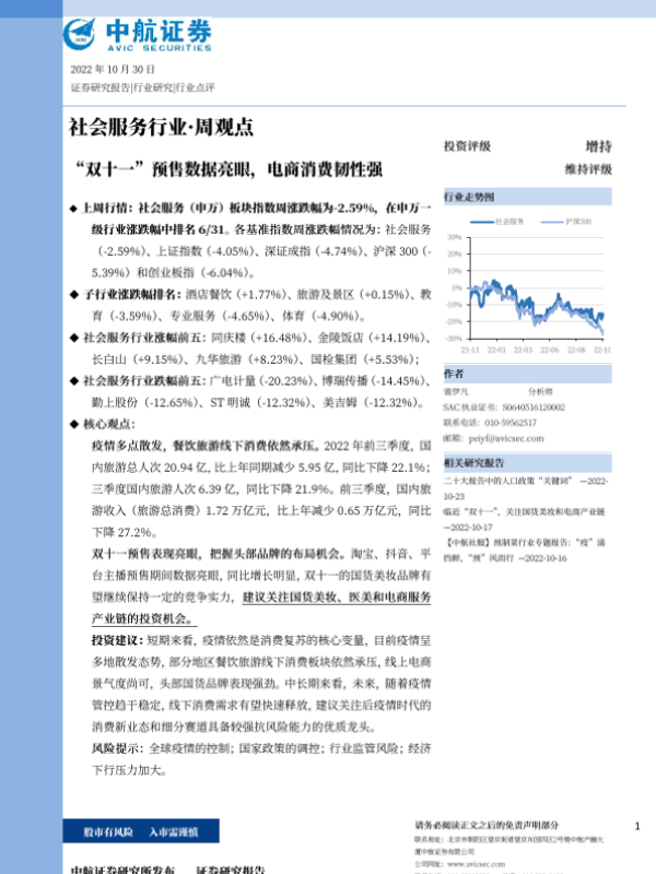 【中航证券】【20221030】社会服务行业·周观点:“双十一”预售数据亮眼,电商消费韧性强-10页