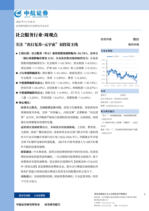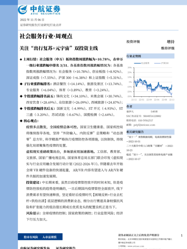 【中航证券】【20221106】社会服务行业·周观点:关注“出行复苏+元宇宙”双投资主线-10页
