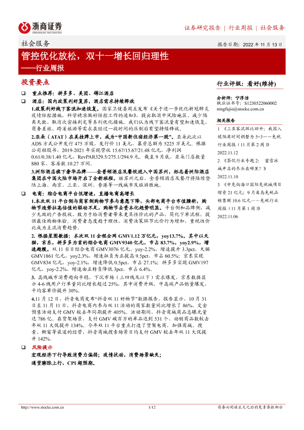 【浙商证券】【20221113】社会服务行业周报:管控优化放松,双十一增长回归理性-12页