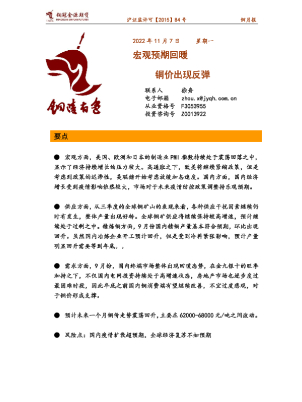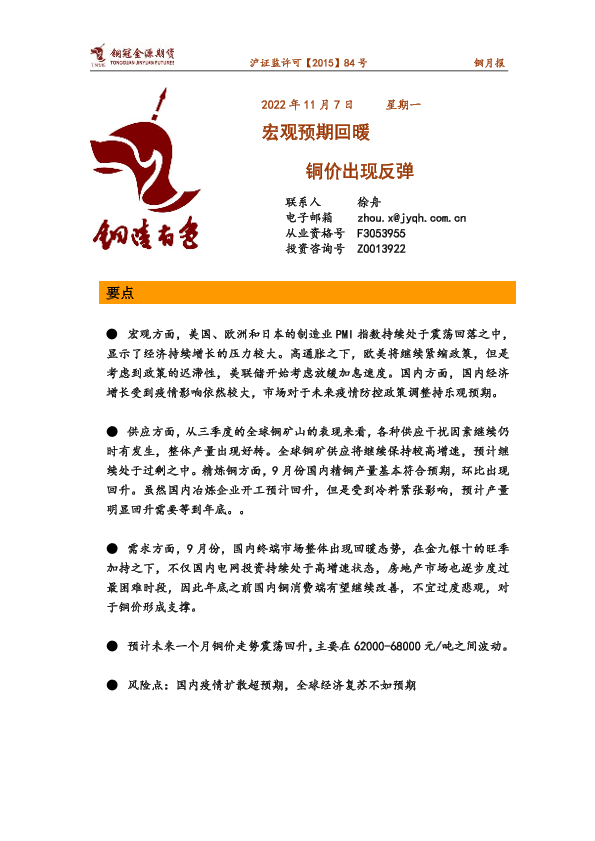 【铜冠金源期货】【20221107】铜月报:宏观预期回暖,铜价出现反弹-16页