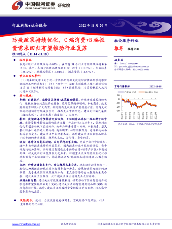 【银河证券】【20221120】社会服务行业周报:防疫政策持续优化,C端消费+B端投资需求回归有望推动行业复苏-14页
