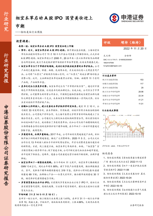【申港证券】【20221120】轻纺美妆行业周报:相宜本草启动A股IPO 国货美妆迎上市潮-15页