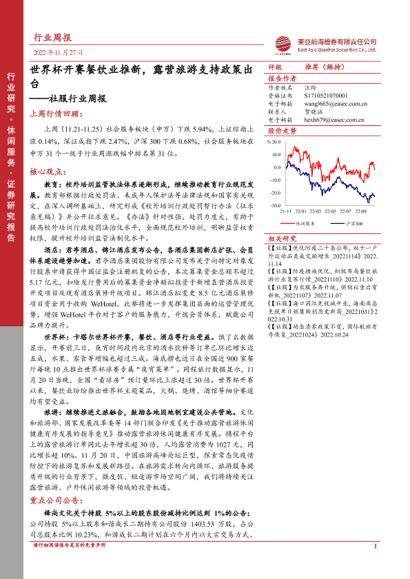 【东亚前海证券】【20221127】社服行业周报:世界杯开赛餐饮业推新,露营旅游支持政策出台-13页