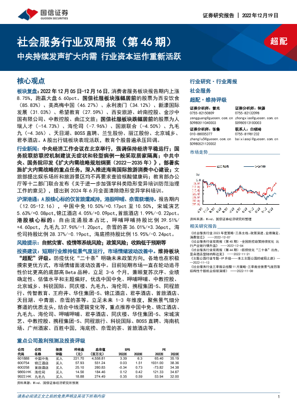 【国信证券】【20221219】社会服务行业双周报:中央持续发声扩大内需 行业资本运作重新活跃-15页