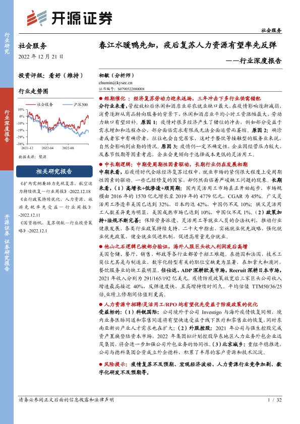 【开源证券】【20221219】社会服务行业深度报告:春江水暖鸭先知,疫后复苏人力资源有望率先反弹-32页