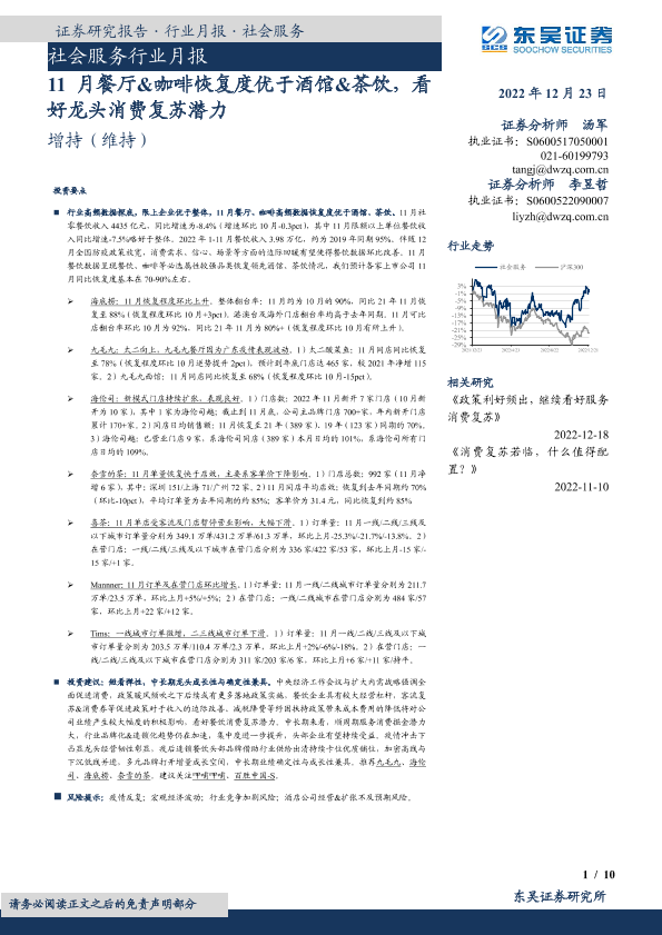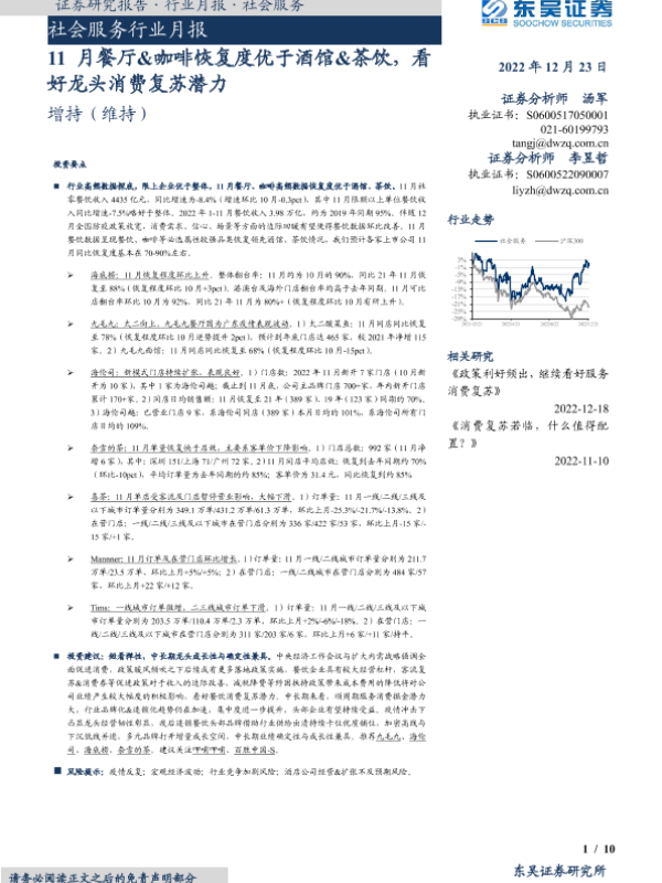 【东吴证券】【20221223】11月餐厅&咖啡恢复度优于酒馆&茶饮,看好龙头消费复苏潜力-10页