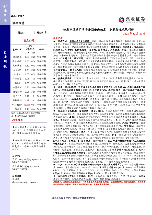 【兴业证券】【20221227】社会服务行业周报:旅游市场或于明年暑期全面恢复,职教再迎政策利好-14页