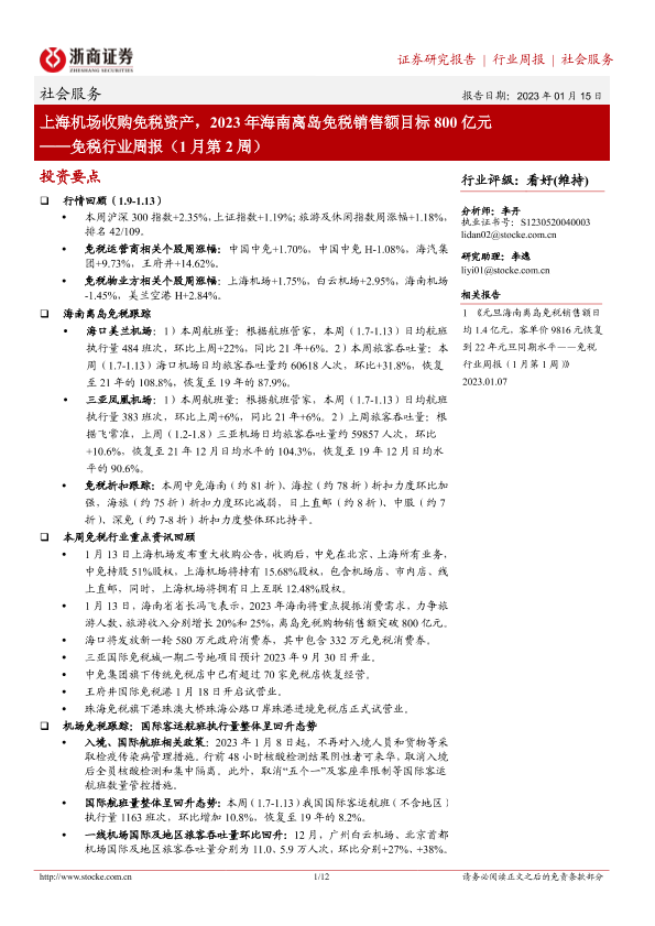 【浙商证券】【20230115】上海机场收购免税资产,2023年海南离岛免税销售额目标800亿元-12页