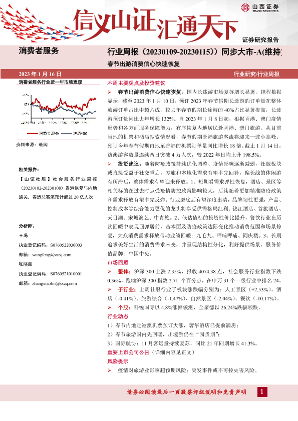 【山西证券】【20230116】消费者服务行业周报:春节出游消费信心快速恢复-10页