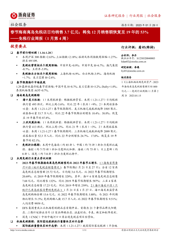 【浙商证券】【20230129】免税行业周报:春节海南离岛免税店日均销售3.7亿元;韩免12月销售额恢复至19年的53%-11页
