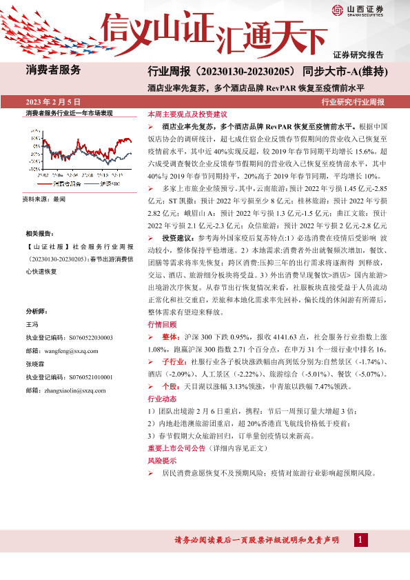 【山西证券】【20230205】消费者服务行业周报:酒店业率先复苏,多个酒店品牌RevPAR恢复至疫情前水平-10页