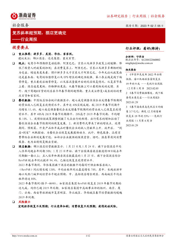 【浙商证券】【20230205】社会服务行业周报:复苏斜率超预期,酒店更确定-12页