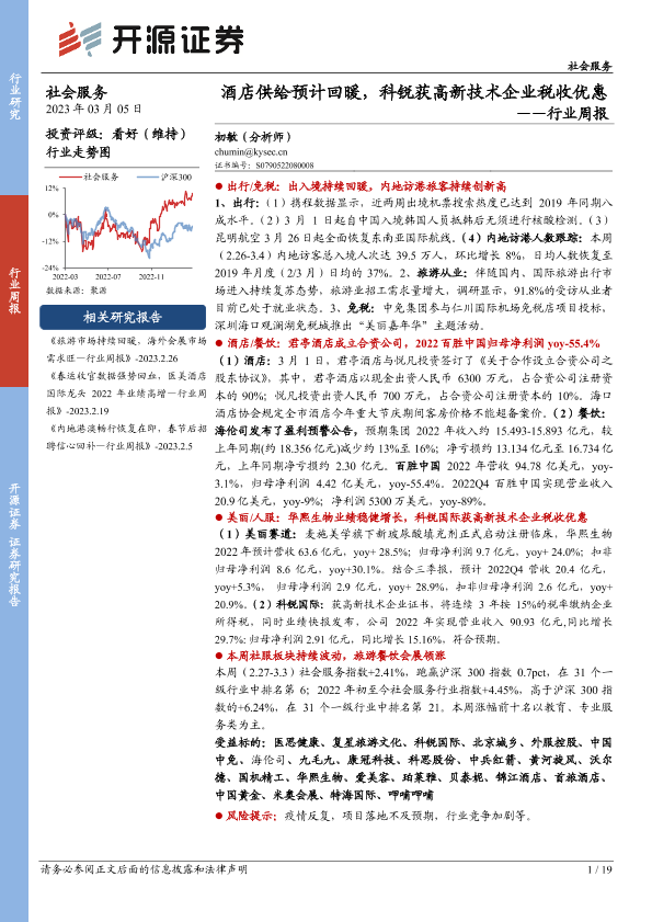 【开源证券】【20230305】社会服务行业周报:酒店供给预计回暖,科锐获高新技术企业税收优惠-19页