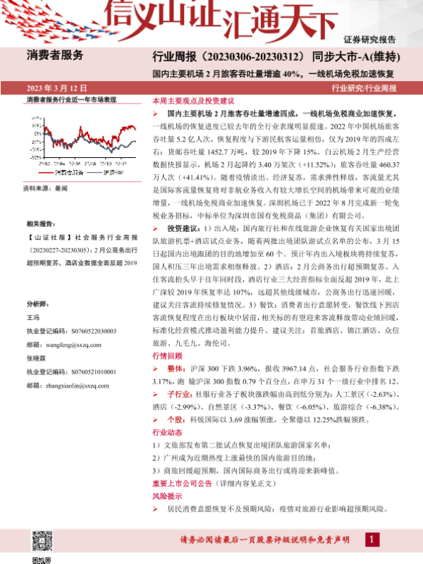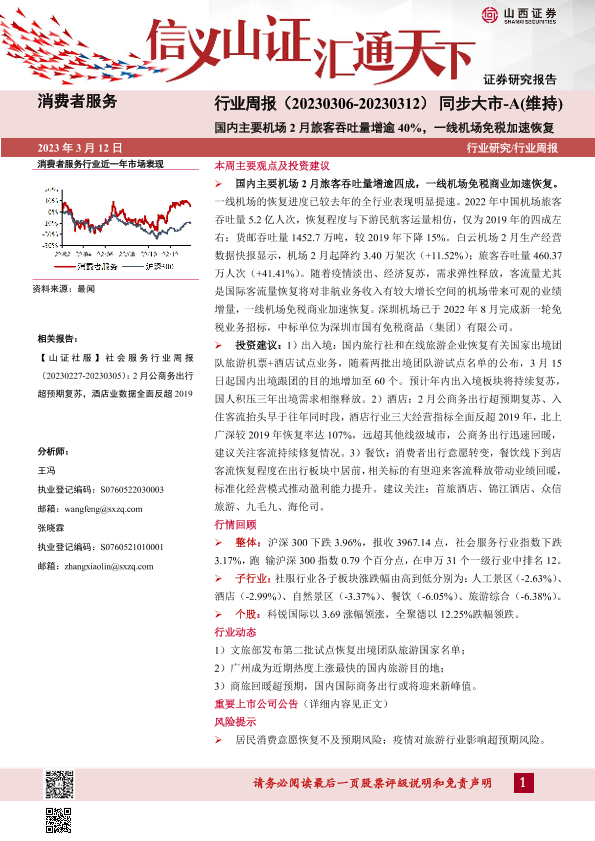 【山西证券】【20230312】消费者服务行业周报:国内主要机场2月旅客吞吐量增逾40%,一线机场免税加速恢复-11页