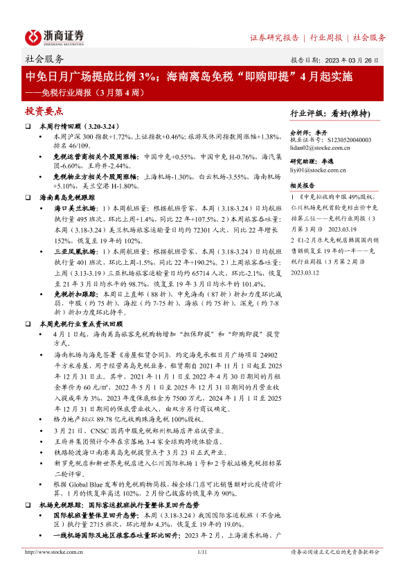 【浙商证券】【20230326】免税行业周报:中免日月广场提成比例3%;海南离岛免税“即购即提”4月起实施-11页