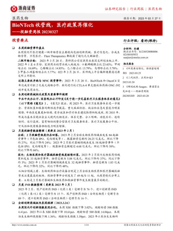 【浙商证券】【20230327】医药生物投融资周报:BioNTech收管线,医疗政策再催化-14页
