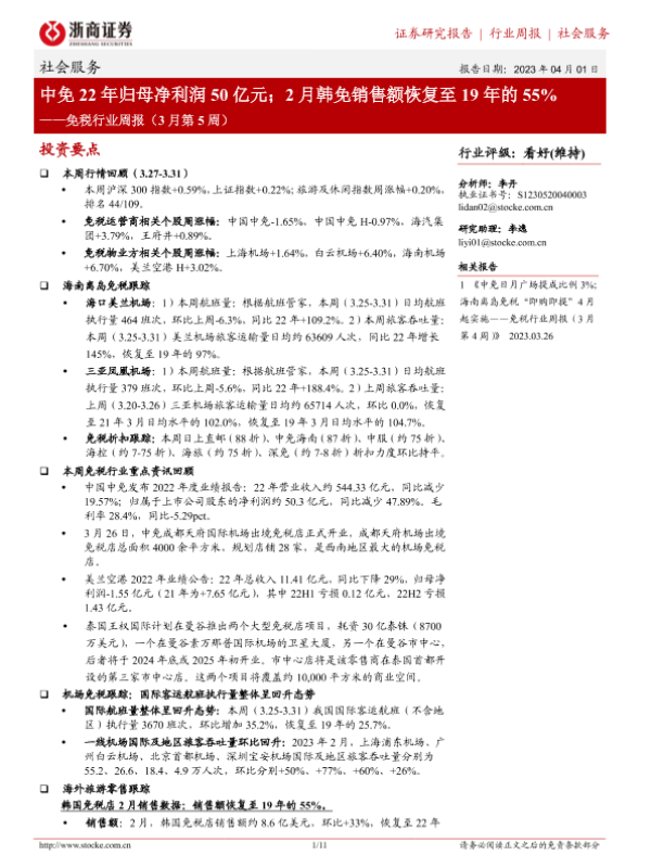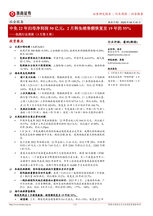 【浙商证券】【20230401】免税行业周报(3月第5周):中免22年归母净利润50亿元;2月韩免销售额恢复至19年的55%-11页
