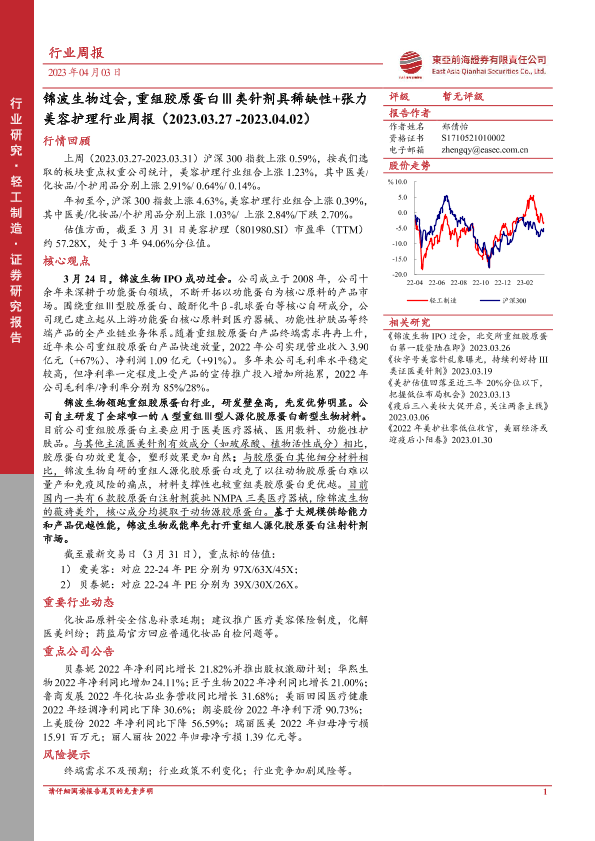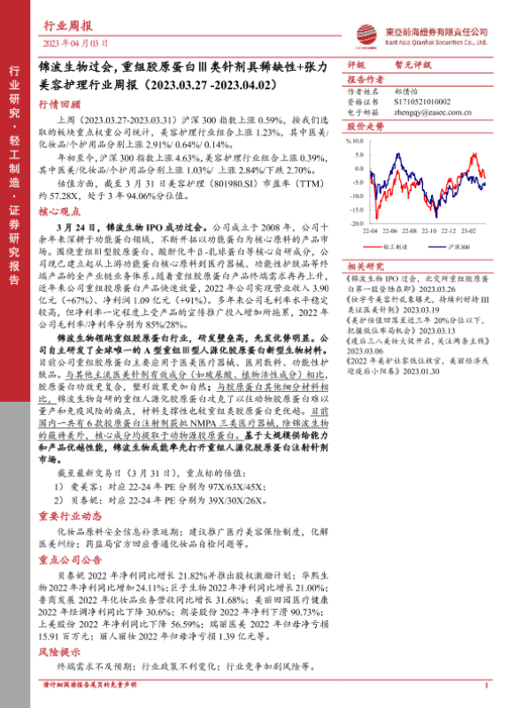 【东亚前海证券】【20230403】美容护理行业周报:锦波生物过会,重组胶原蛋白Ⅲ类针剂具稀缺性+张力-25页