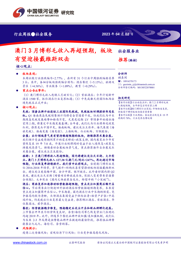 【银河证券】【20230402】社会服务行业周报:澳门3月博彩毛收入再超预期,板块有望迎接戴维斯双击-13页