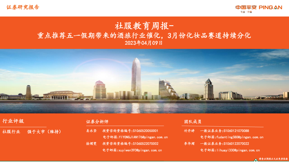 【平安证券】【20230409】社服教育周报:重点推荐五一假期带来的酒旅行业催化,3月份化妆品赛道持续分化-15页