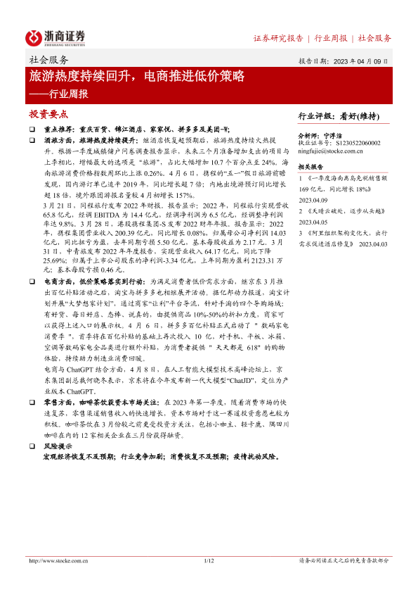 【浙商证券】【20230409】社会服务行业周报:旅游热度持续回升,电商推进低价策略-12页