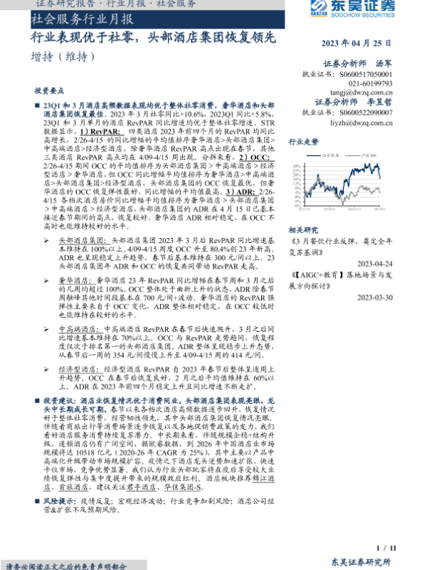 【东吴证券】【20230425】社会服务行业月报:行业表现优于社零,头部酒店集团恢复领先-11页