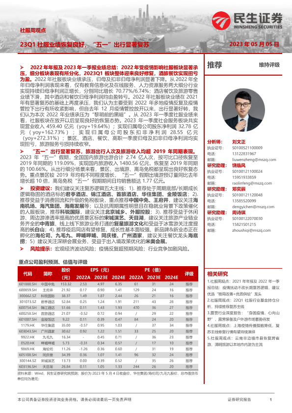 【民生证券】【20230505】23Q1社服业绩恢复良好,“五一”出行显著复苏-36页