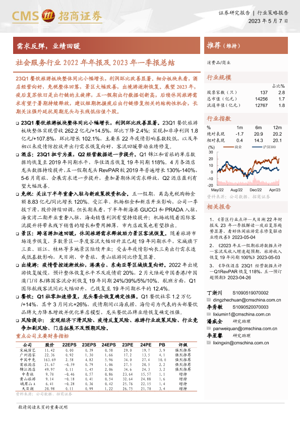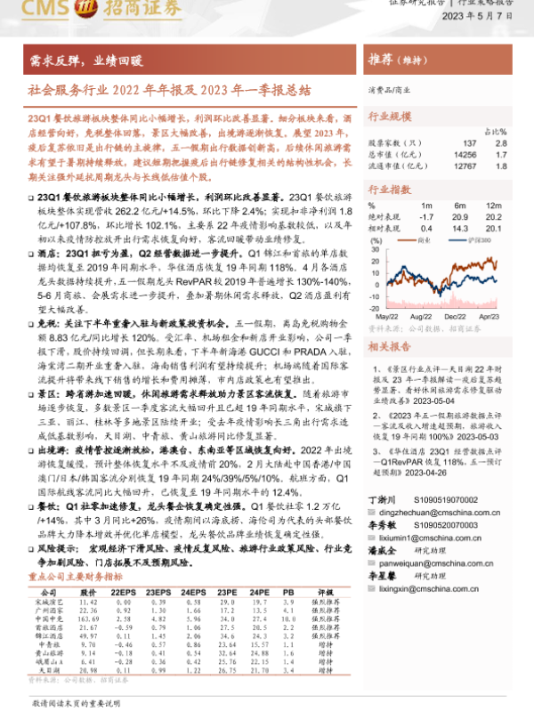 【海通证券】【20230507】社会服务行业2022年年报及2023年一季报总结:需求反弹,业绩回暖-19页
