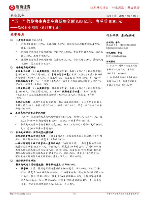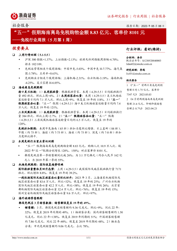 【浙商证券】【20230506】“五一”假期海南离岛免税购物金额8.83亿元、客单价8101元-11页