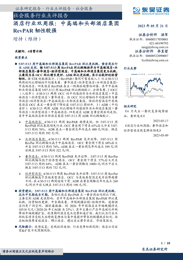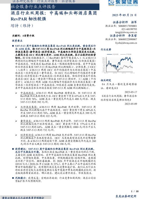【东吴证券】【20230521】酒店行业双周报:中高端和头部酒店集团RevPAR韧性较强-10页