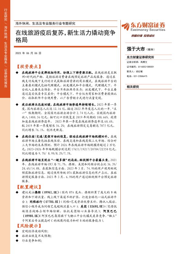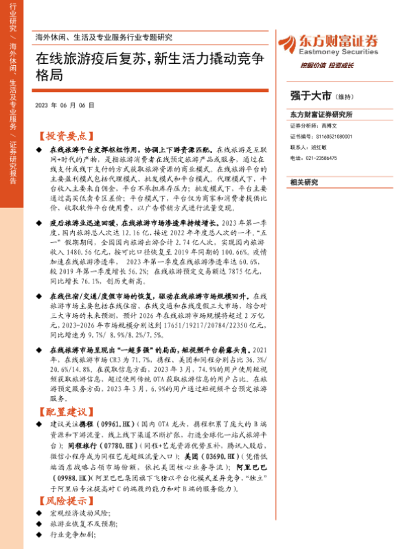 【东方财富证券】【20230606】海外休闲、生活及专业服务行业专题研究:在线旅游疫后复苏,新生活力撬动竞争格局-27页