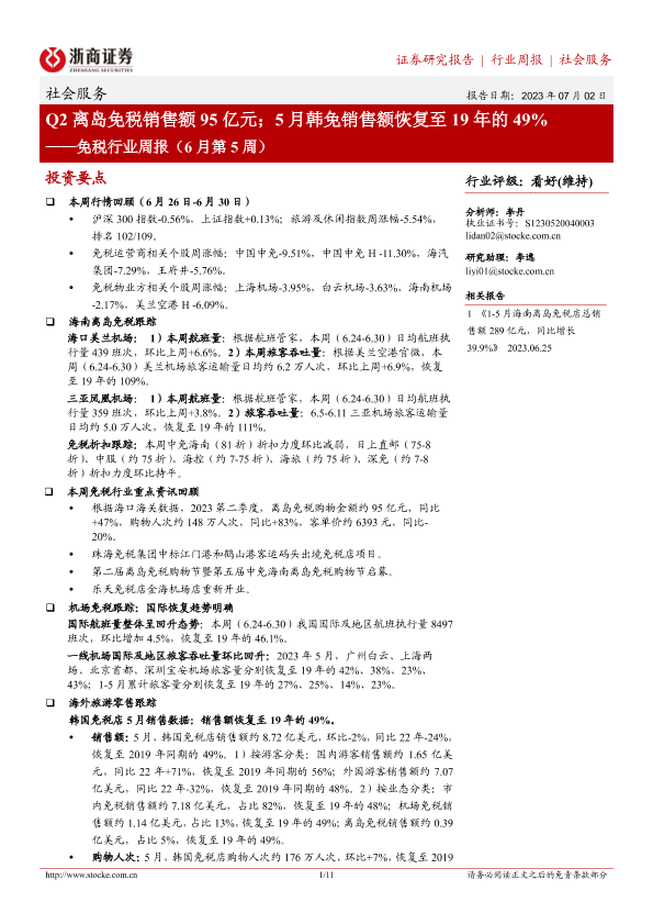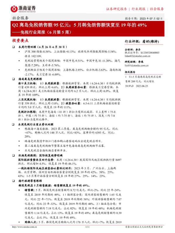 【浙商证券】【20230702】Q2离岛免税销售额95亿元;5月韩免销售额恢复至19年的49%-11页