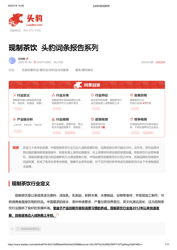 【头豹研究院】【20230706】现制茶饮 头豹词条报告系列-17页