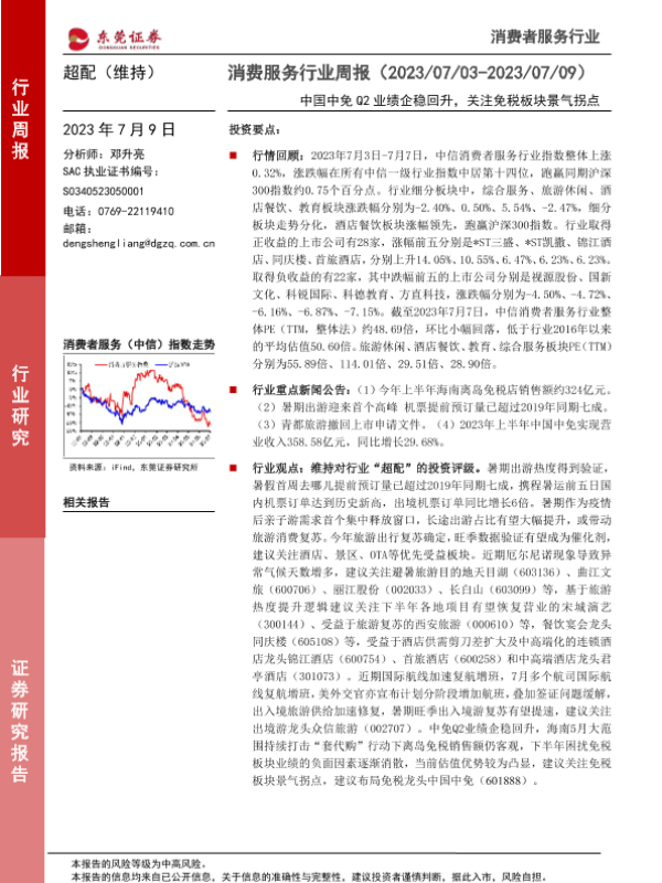 【东莞证券】【20230709】消费服务行业周报:中国中免Q2业绩企稳回升,关注免税板块景气拐点-11页