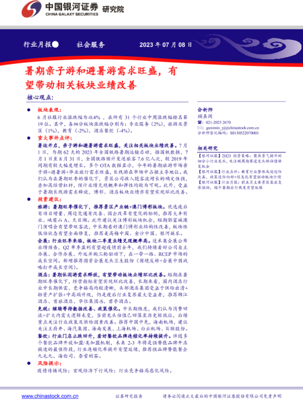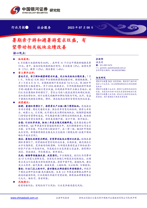 【银河证券】【20230708】社会服务行业月报:暑期亲子游和避暑游需求旺盛,有望带动相关板块业绩改善-11页