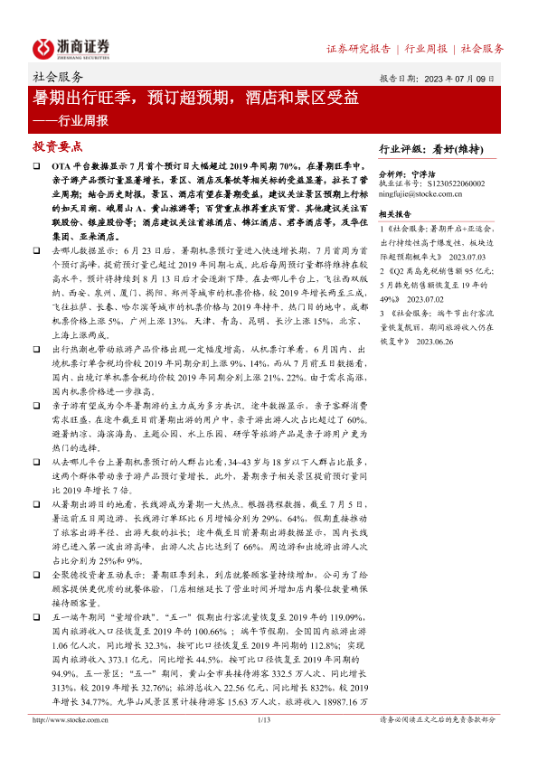 【浙商证券】【20230709】社会服务行业周报:暑期出行旺季,预订超预期,酒店和景区受益-13页