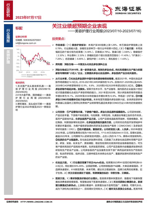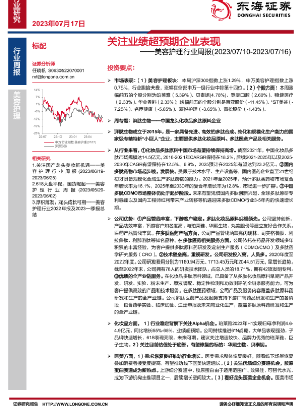 化妆品原料 医美 多肽生物 美容护理 行业周报