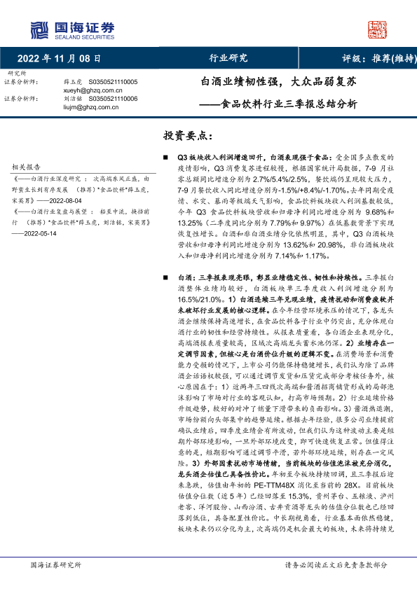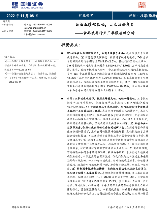 【国海证券】【20221108】食品饮料行业三季报总结分析:白酒业绩韧性强,大众品弱复苏-46页