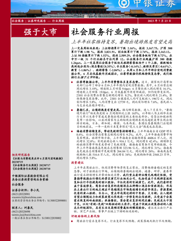 【中银证券】【20230723】社会服务行业周报:上半年社零维持复苏,暑期出境游热度有望走高-18页