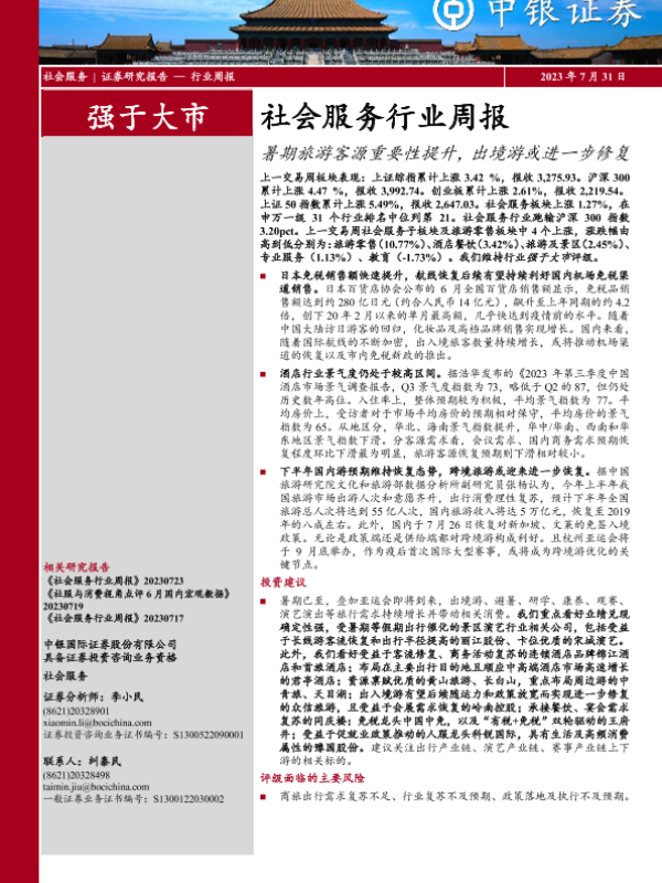 【中银证券】【20230731】社会服务行业周报:暑期旅游客源重要性提升,出境游或进一步修复-20页