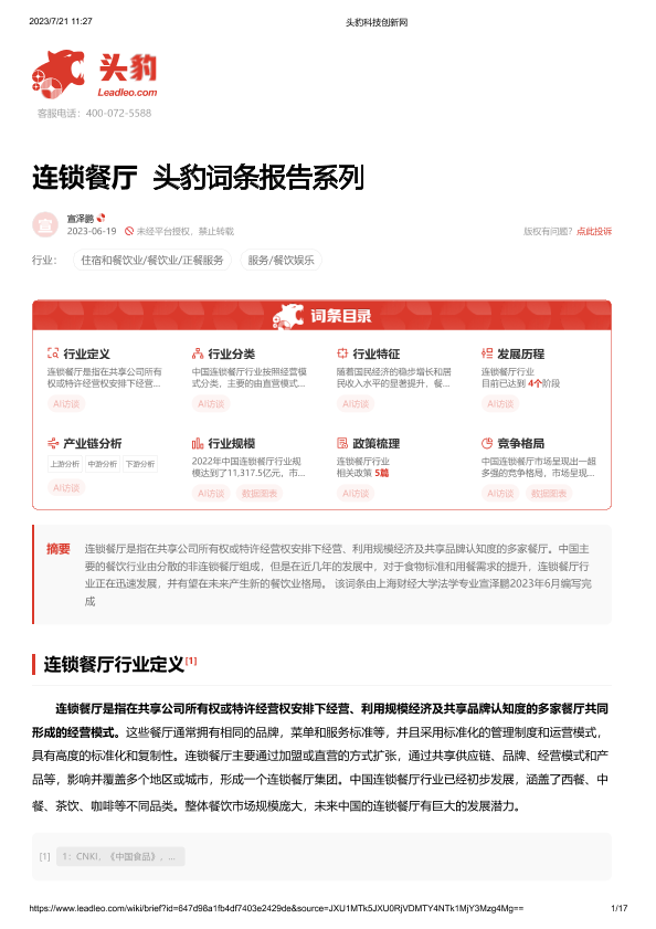 【头豹研究院】【20230619】连锁餐厅 头豹词条报告系列-17页