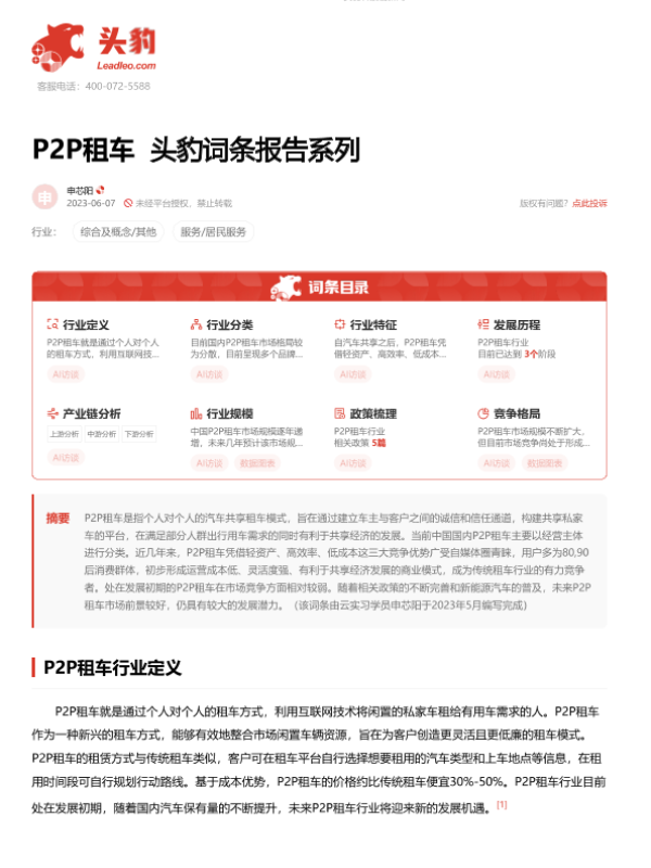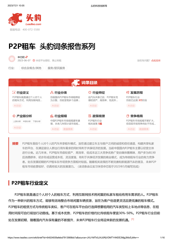 【头豹研究院】【20230607】P2P租车 头豹词条报告系列-16页