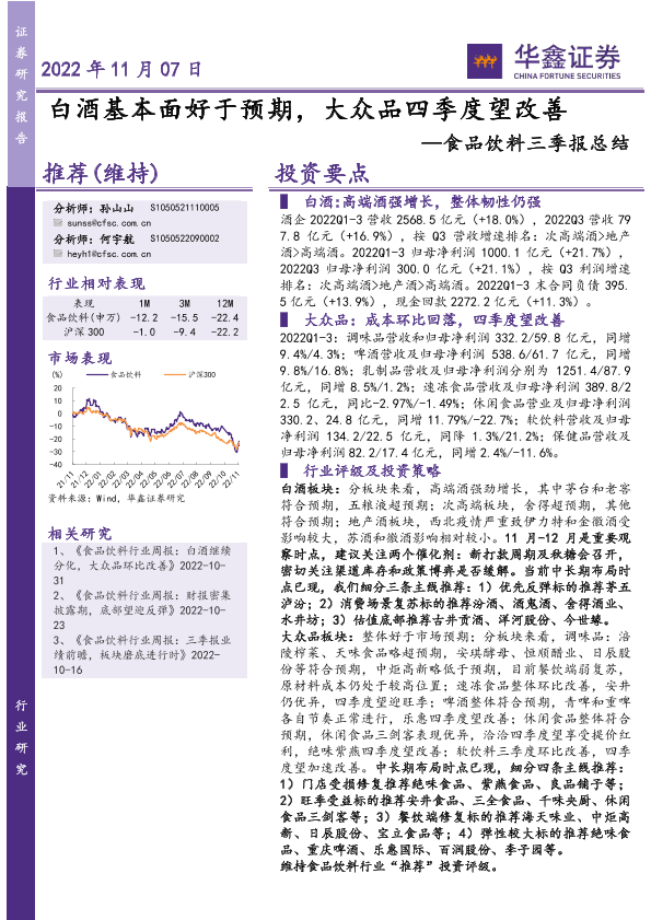 【华鑫证券】【20221107】食品饮料行业三季报总结:白酒基本面好于预期,大众品四季度望改善-45页